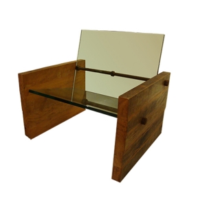 Estrutura em madeira peroba de demolição e barra de ferro oxidado. Assento e encosto em vidro 19mm.