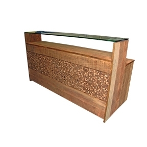 Description: Estrutura em madeira de demolição, revestimento em pastilha de côco e tampo em vidro 19mm. Medidas: 2,00 x 1,10 x 0,80m