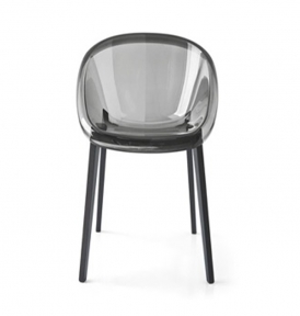 Cadeira com pés em madeira pintada e assento em acrílico translúcido fumê.