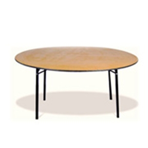 Mesa redonda para toalha com tampo cru em MDF e pés dobráveis em ferro.