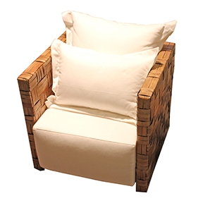 Poltrona para lounge infantil, com braços em trama de casca de buriti e assento e encosto em capa de sarja cru.