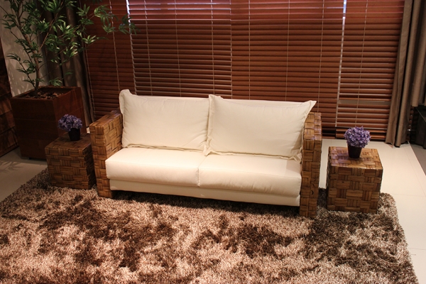 Sofá para lounge infantil. Braços laterais em trama de casca de buriti e assento e encosto em capa de sarja cru.