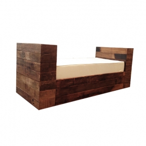 Namoradeira em madeira de demolição com estofado com capa de sarja cru.