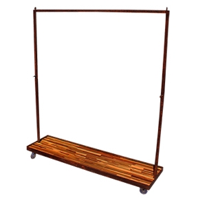 Descripción: Estrutura em ferro oxidado e base em madeira teca mosaico com rodízios de silicone. Dimensões: 1,50 x 0,40 x 1,60m