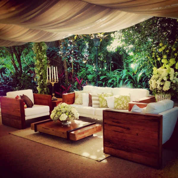 Estrutura em madeira peroba rosa e revestimento em sarja cru.