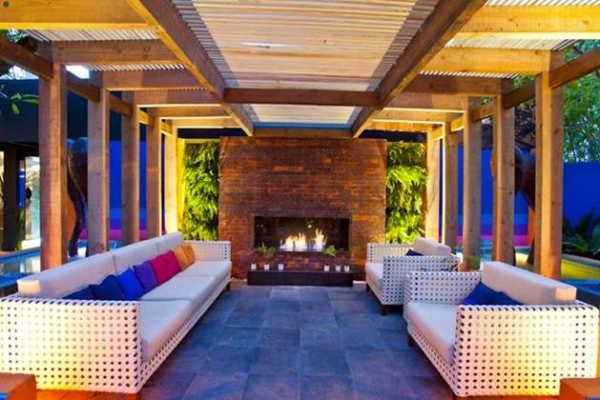 Sofá para área externa com estrutura em madeira de demolição de peroba rosa, com trama em fibra sintética e revestimento com tecido acquablock.