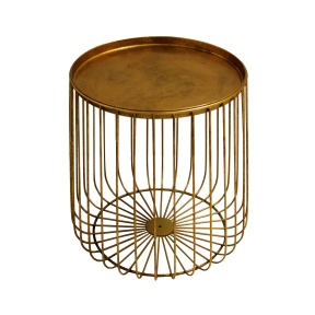 Descrição: Mesa lateral de ferro e espelho de ouro velho com tampo bandeja gaiola. Diâmetro: 0,53 m Altura: 0,625 m