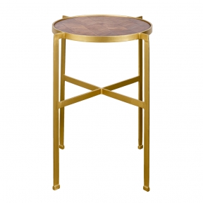 Descrição: Mesa lateral ferro dourada e madeira baixa. Largura: 0,48 m Altura: 0,56 m Profundidade: 0,48 m