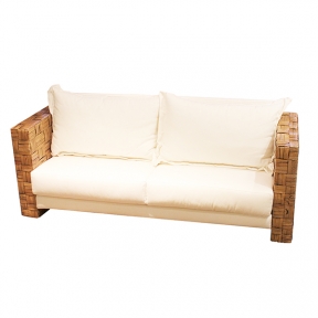 Sofá para lounge infantil. Braços laterais em trama de casca de buriti e assento e encosto em capa de sarja cru.